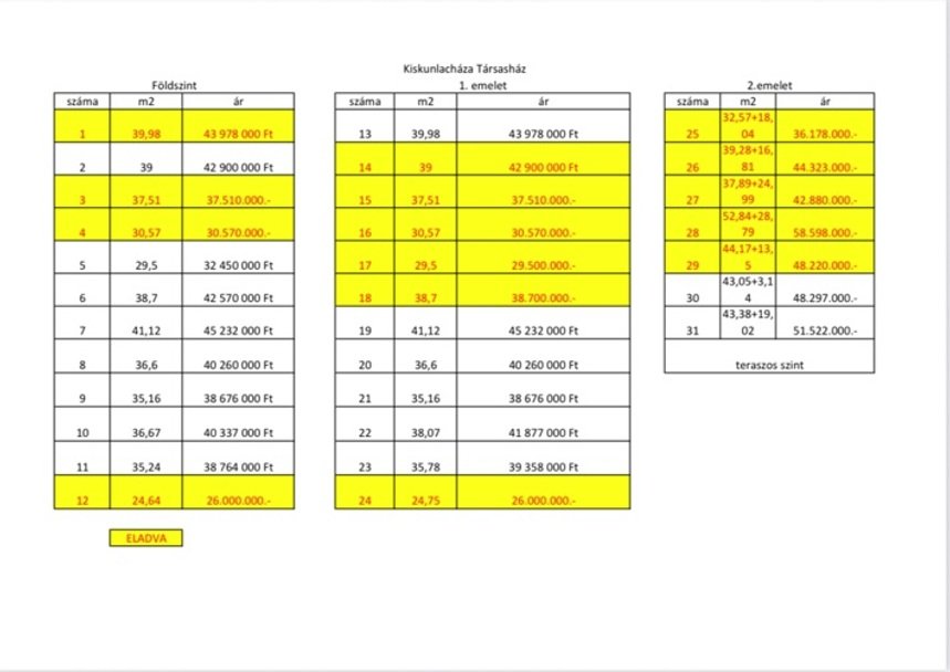 Feltöltött képek között megtalálhatóak az alaprajzok és egy táblázatban az eladó lakások négyzetméterrel és árral.